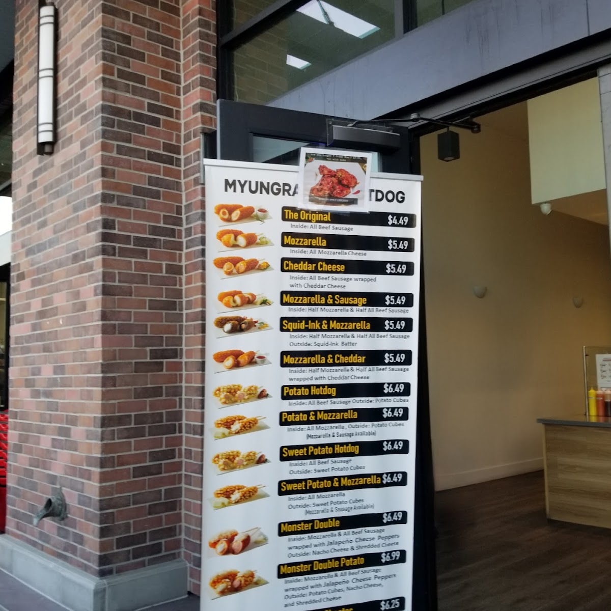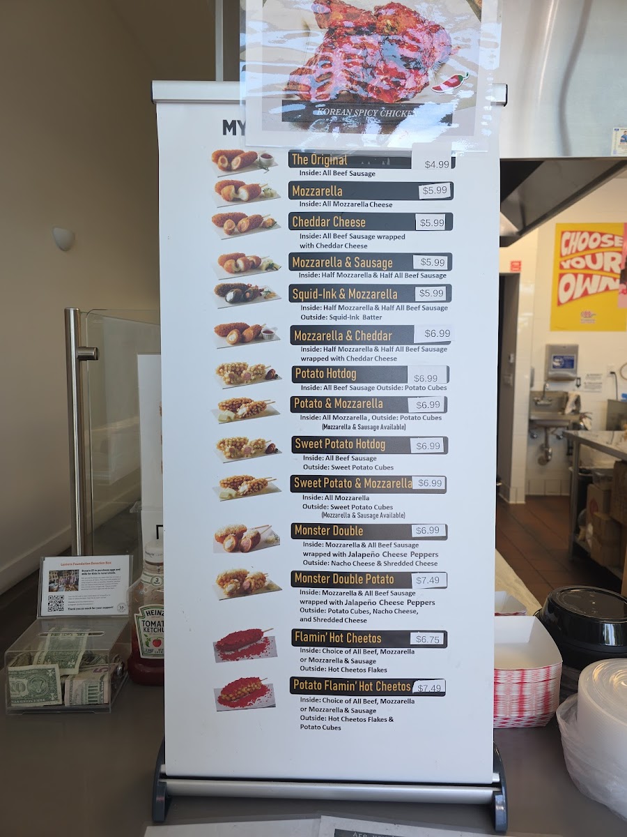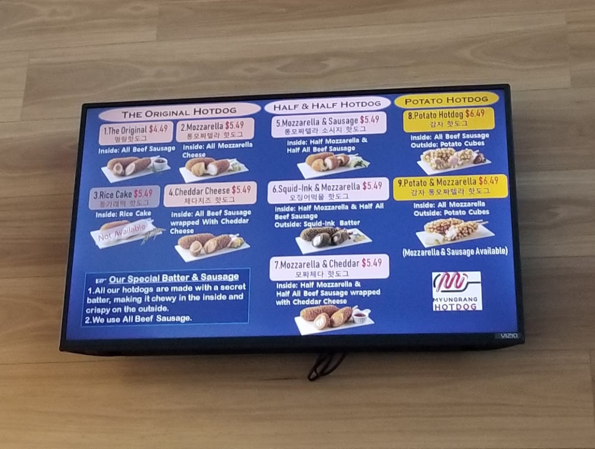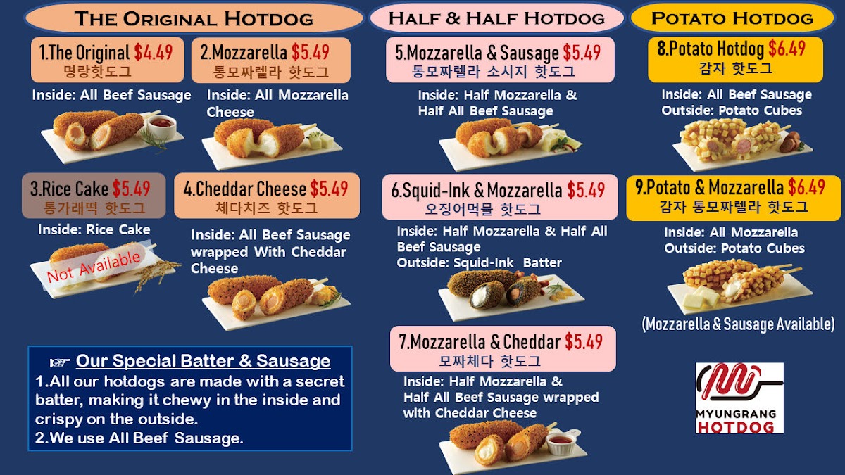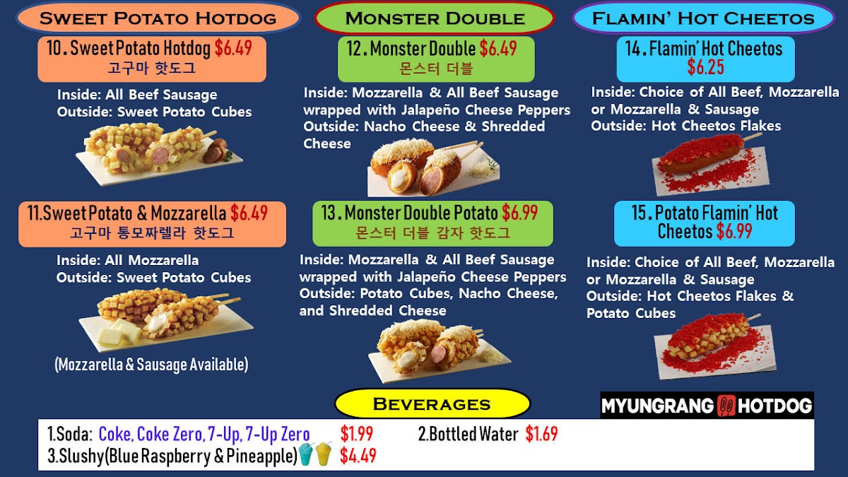 The menu at Myungrang Hot Dog in Dublin offers a unique and flavorful variety of hot dogs, with something to suit every taste. The Original Hotdog features classic options with Mozzarella and Cheddar Cheese. For those looking for a little variety, the Half & Half Hotdog combines exciting flavors like Mozzarella & Sausage, Squid-Ink & Mozzarella, and Mozzarella & Cheddar. The Potato Hotdog and Sweet Potato Hotdog sections each include options such as Potato & Mozzarella or Sweet Potato & Mozzarella, as well as combinations like Potato & 1/2 Sausage + 1/2 Mozzarella and Sweet Potato & 1/2 Sausage + 1/2 Mozzarella. If you're craving something truly indulgent, the Monster Double and Monster Double Potato offer a hearty choice. For a spicier twist, the Flamin' Hot Cheetos and Potato Flamin' Hot Cheetos variations, along with the Spicy Chicken, bring bold flavors to the table. To complement your meal, a selection of Soda and Slushy beverages is available to quench your thirst. The diverse menu ensures there's a perfect option for every craving, making Myungrang Hot Dog a must-visit spot for hot dog enthusiasts.